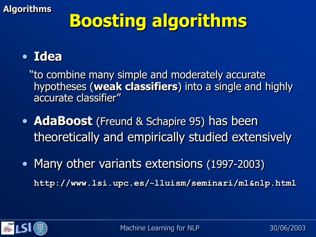 Algorithms Boosting algorithms • Idea “to combine many simple and moderately accurate hypotheses (weak classifiers) into a single and highly accurate classifier” • AdaBoost(Freund & Schapire 95) has been theoretically and empirically studied extensively • Many other variants extensions (1997-2003) http://www.lsi.upc.es/~lluism/seminari/ml&nlp.html