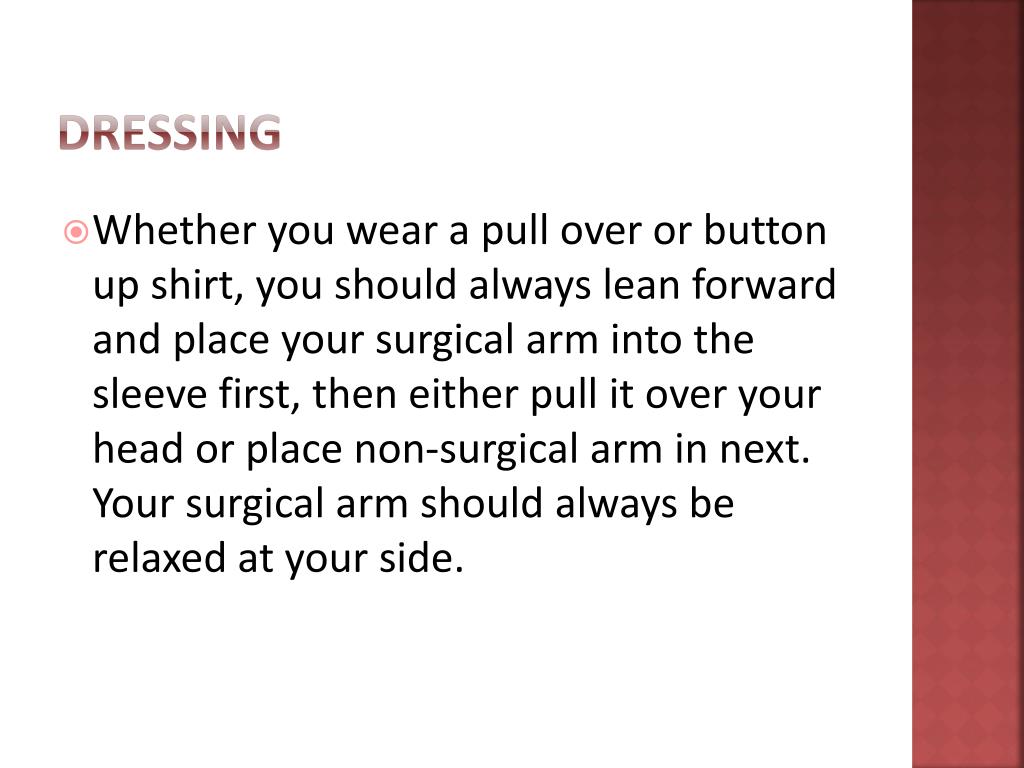 dressing • Whether you wear a pull over or button up shirt, you should always lean forward and place your surgical arm into the sleeve first, then either pull it over your head or place non-surgical arm in next. Your surgical arm should always be relaxed at your side.