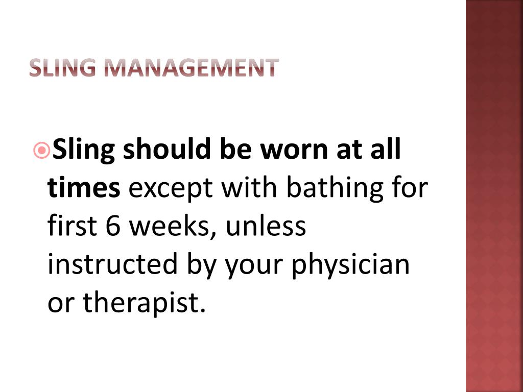 Sling Management • Sling should be worn at all times except with bathing for first 6 weeks, unless instructed by your physician or therapist.