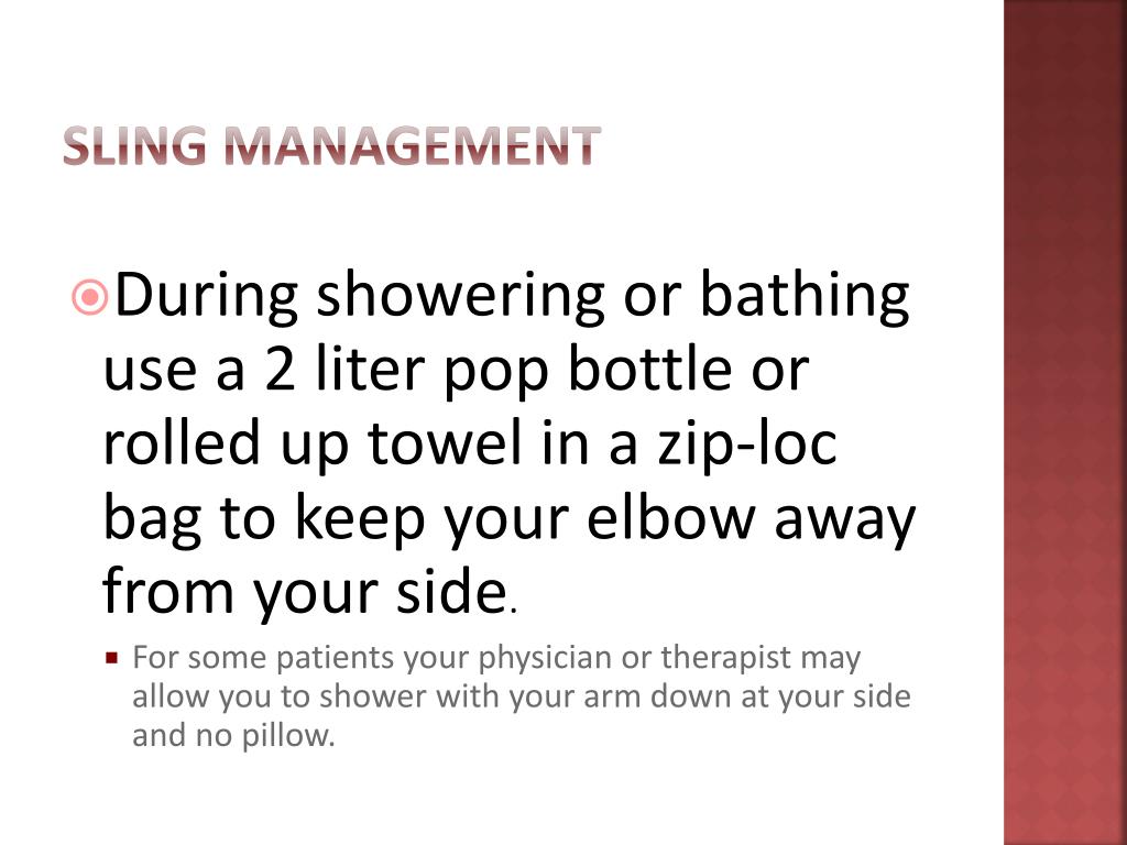 Sling management • During showering or bathing use a 2 liter pop bottle or rolled up towel in a zip-loc bag to keep your elbow away from your side. • For some patients your physician or therapist may allow you to shower with your arm down at your side and no pillow.