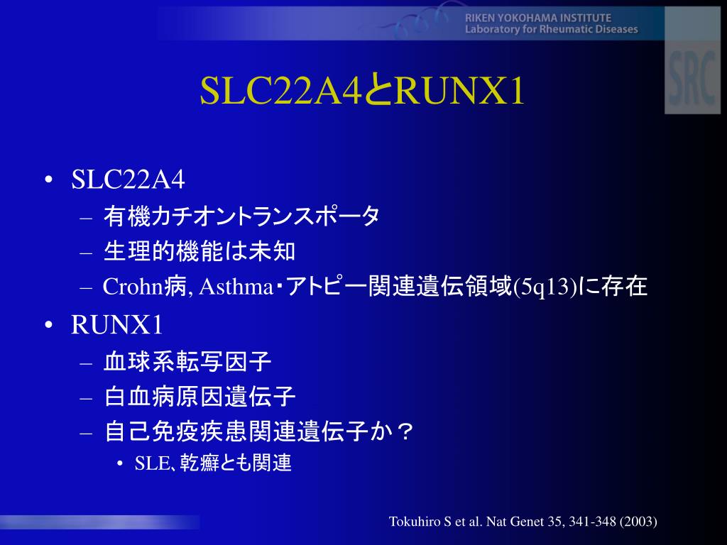 SLC22A4とRUNX1 • SLC22A4 • 有機カチオントランスポータ • 生理的機能は未知 • Crohn病, Asthma・アトピー関連遺伝領域(5q13)に存在 • RUNX1 • 血球系転写因子 • 白血病原因遺伝子 • 自己免疫疾患関連遺伝子か? • SLE、乾癬とも関連 Tokuhiro S et al. Nat Genet 35, 341-348 (2003)