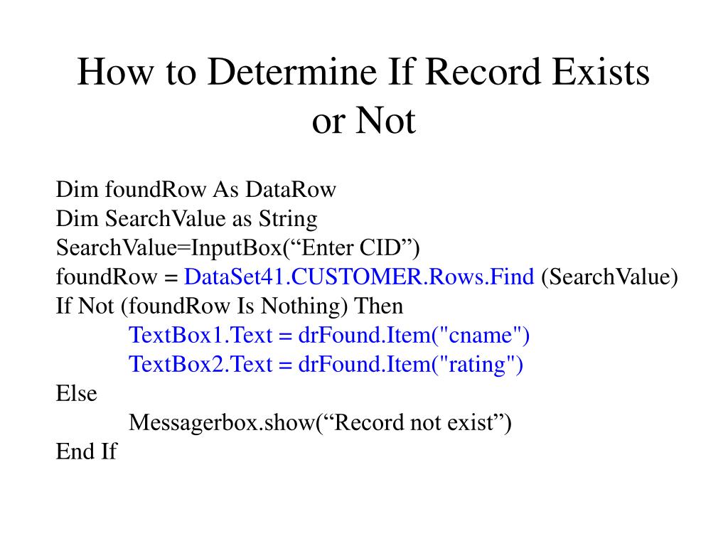 How to Determine If Record Exists or Not Dim foundRow As DataRow Dim SearchValue as String SearchValue=InputBox(“Enter CID”) foundRow = DataSet41.CUSTOMER.Rows.Find (SearchValue) If Not (foundRow Is Nothing) Then TextBox1.Text = drFound.Item("cname") TextBox2.Text = drFound.Item("rating") Else Messagerbox.show(“Record not exist”) End If