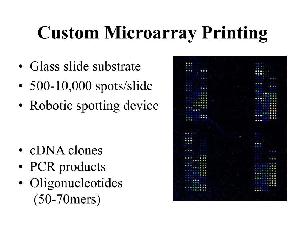 Custom Microarray Printing • Glass slide substrate • 500-10,000 spots/slide • Robotic spotting device • cDNA clones • PCR products • Oligonucleotides • (50-70mers)