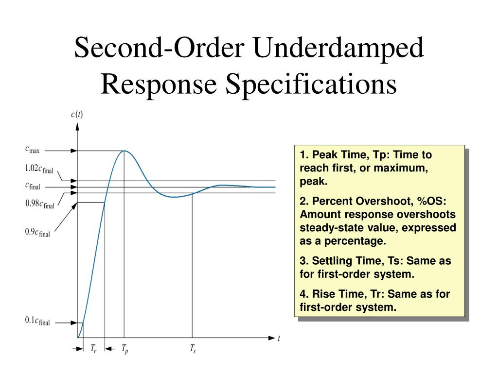 Second-Order Underdamped Response Specifications 1. Peak Time, Tp: Time to reach first, or maximum, peak. 2. Percent Overshoot, %OS: Amount response overshoots steady-state value, expressed as a percentage. 3. Settling Time, Ts: Same as for first-order system. 4. Rise Time, Tr: Same as for first-order system.