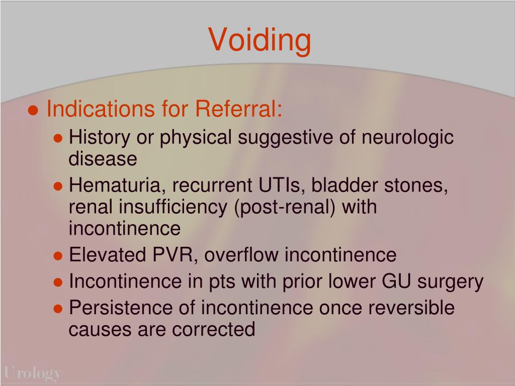 Voiding • Indications for Referral: • History or physical suggestive of neurologic disease • Hematuria, recurrent UTIs, bladder stones, renal insufficiency (post-renal) with incontinence • Elevated PVR, overflow incontinence • Incontinence in pts with prior lower GU surgery • Persistence of incontinence once reversible causes are corrected