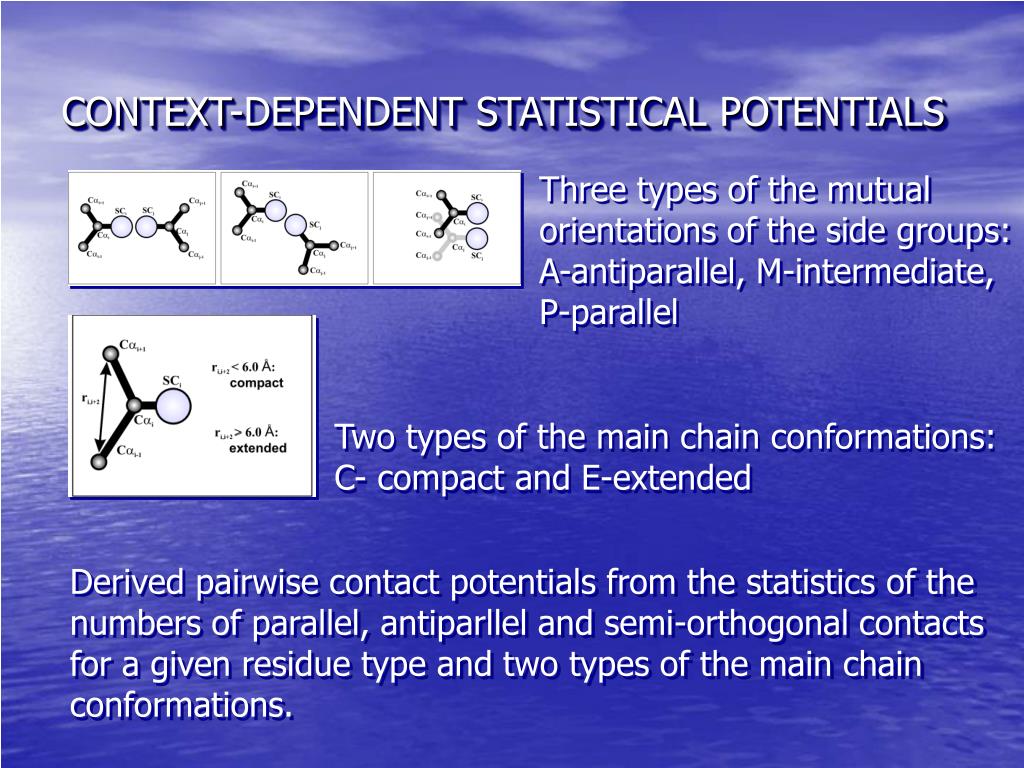 CONTEXT-DEPENDENT STATISTICAL POTENTIALS Three types of the mutual orientations of the side groups: A-antiparallel, M-intermediate, P-parallel Two types of the main chain conformations: C- compact and E-extended Derived pairwise contact potentials from the statistics of the numbers of parallel, antiparllel and semi-orthogonal contacts for a given residue type and two types of the main chain conformations.