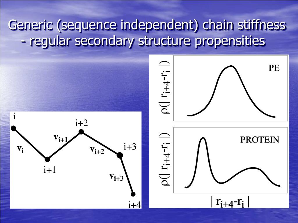 Generic (sequence independent) chain stiffness 1 B1 = f×eg for: (vi-1 • vi+3)<0 B2 = -f×eg-g×eg for: | ri+4 –ri |< 7.0 Å and “right handed” twist or: | ri+4 –ri |>11.0 Å and b-type geometry