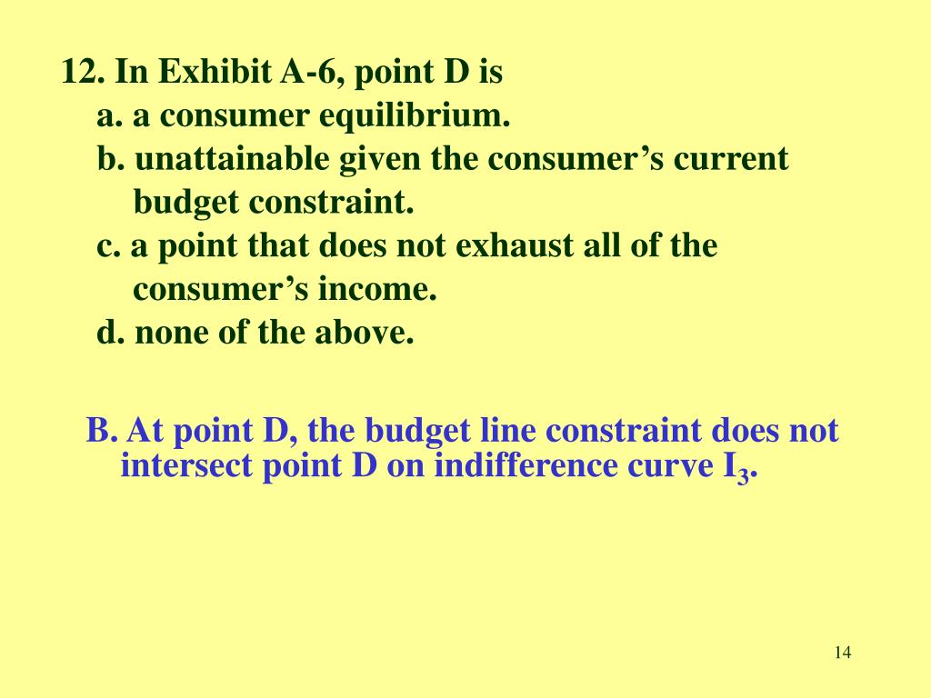 12. In Exhibit A-6, point D is a. a consumer equilibrium. b. unattainable given the consumer’s current budget constraint. c. a point that does not exhaust all of the consumer’s income. d. none of the above. B. At point D, the budget line constraint does not intersect point D on indifference curve I3.