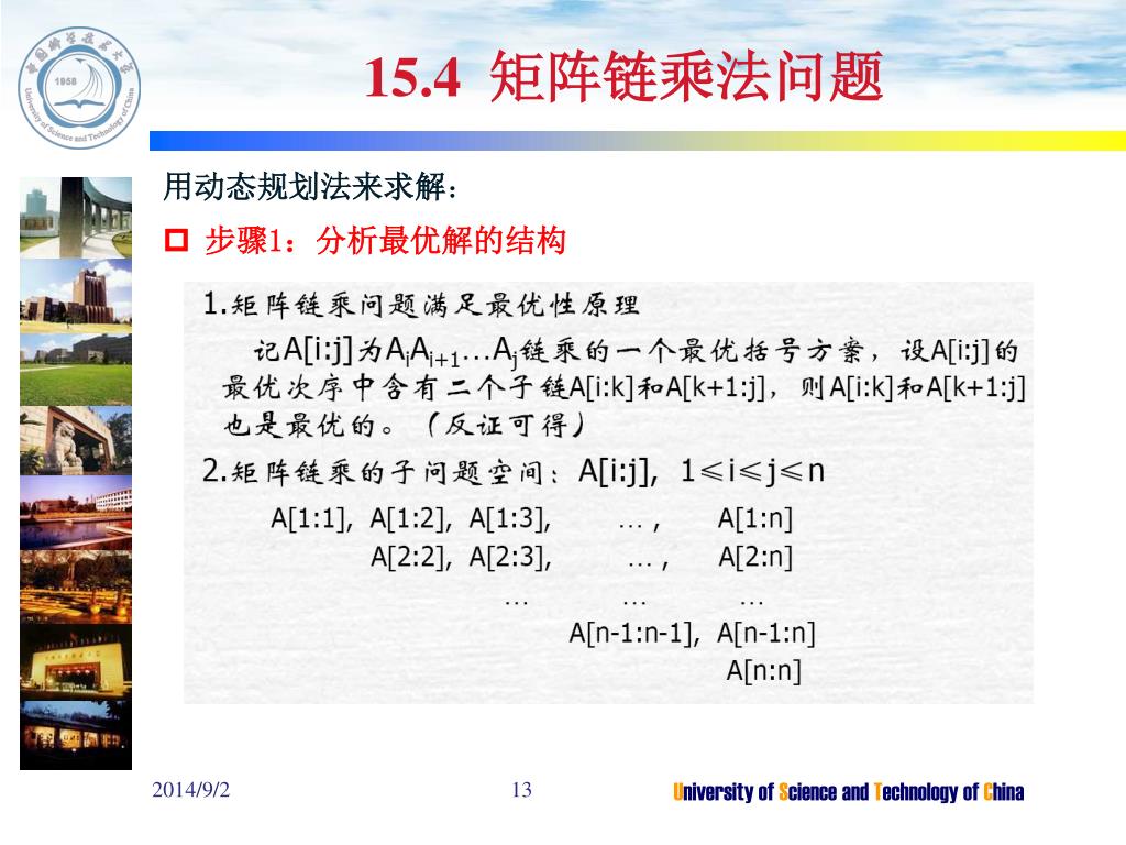 15.4 矩阵链乘法问题 用动态规划法来求解: • 步骤1:分析最优解的结构