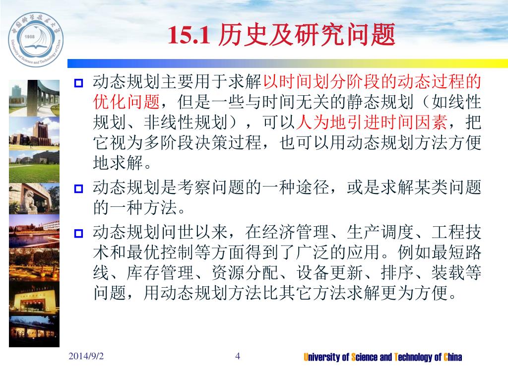 15.1 历史及研究问题 • 动态规划主要用于求解以时间划分阶段的动态过程的优化问题,但是一些与时间无关的静态规划(如线性规划、非线性规划),可以人为地引进时间因素,把它视为多阶段决策过程,也可以用动态规划方法方便地求解。 • 动态规划是考察问题的一种途径,或是求解某类问题的一种方法。 • 动态规划问世以来,在经济管理、生产调度、工程技术和最优控制等方面得到了广泛的应用。例如最短路线、库存管理、资源分配、设备更新、排序、装载等问题,用动态规划方法比其它方法求解更为方便。