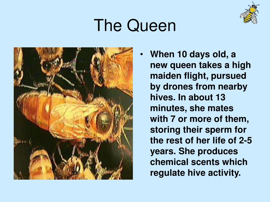 When 10 days old, a new queen takes a high maiden flight, pursued by drones from nearby hives. In about 13 minutes, she mates with 7 or more of them, storing their sperm for the rest of her life of 2-5 years. She produces chemical scents which regulate hive activity. The Queen