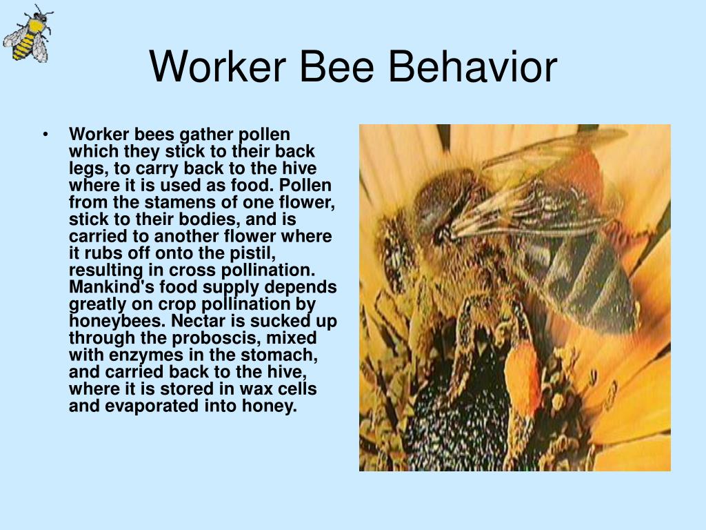 Worker bees gather pollen which they stick to their back legs, to carry back to the hive where it is used as food. Pollen from the stamens of one flower, stick to their bodies, and is carried to another flower where it rubs off onto the pistil, resulting in cross pollination. Mankind's food supply depends greatly on crop pollination by honeybees.Nectar is sucked up through the proboscis, mixed with enzymes in the stomach, and carried back to the hive, where it is stored in wax cells and evaporated into honey. Worker Bee Behavior