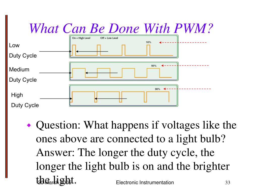 What Can Be Done With PWM? Low Duty Cycle • Question: What happens if voltages like the ones above are connected to a light bulb? Answer: The longer the duty cycle, the longer the light bulb is on and the brighter the light. Medium Duty Cycle High Duty Cycle Electronic Instrumentation