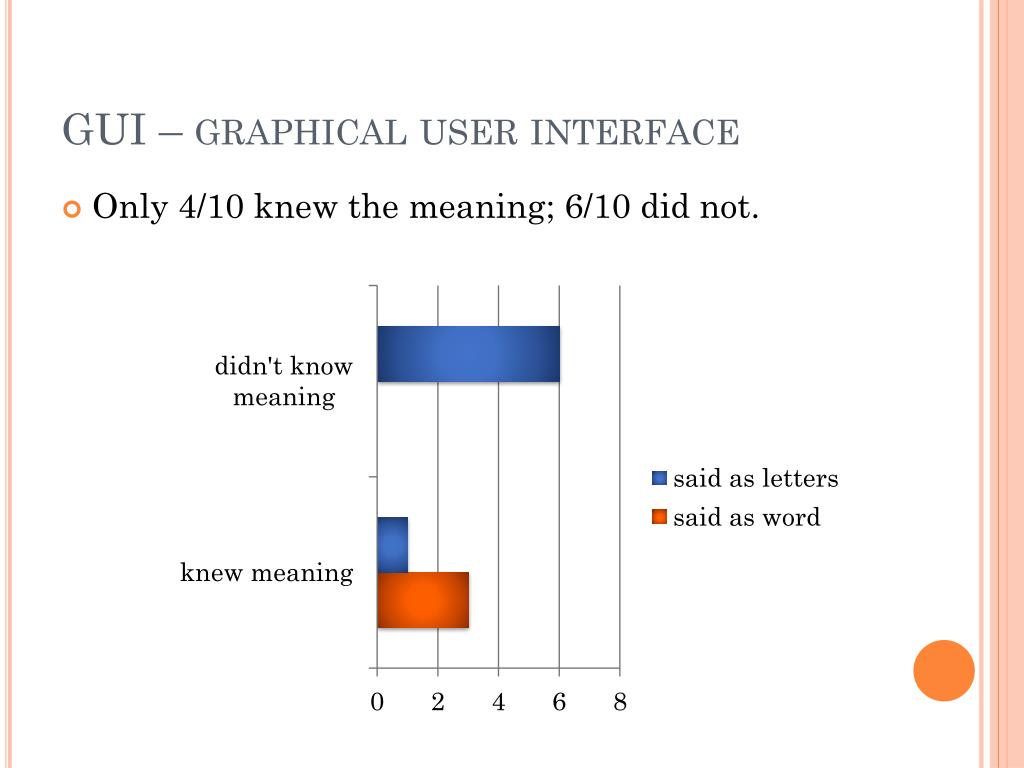 GUI – graphical user interface • Only 4/10 knew the meaning; 6/10 did not.