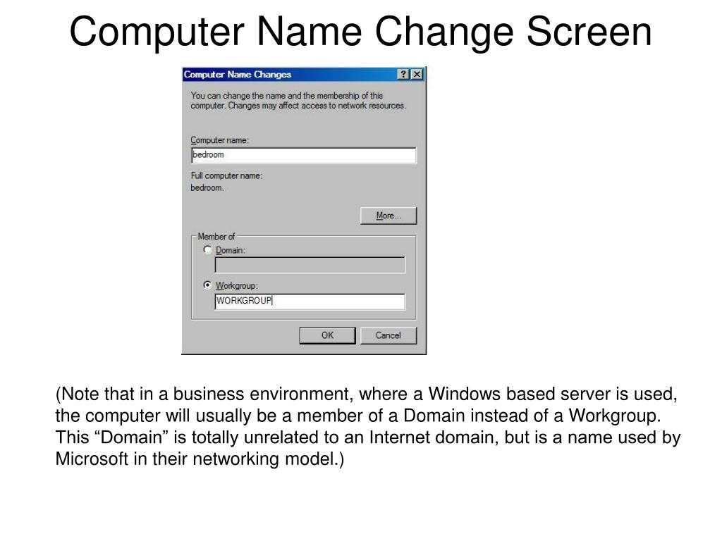 Computer Name Change Screen (Note that in a business environment, where a Windows based server is used, the computer will usually be a member of a Domain instead of a Workgroup. This “Domain” is totally unrelated to an Internet domain, but is a name used by Microsoft in their networking model.)