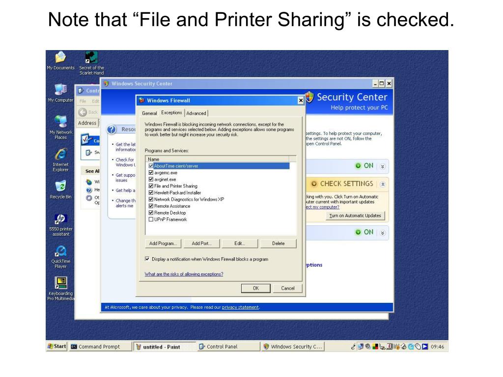 Click the “Exceptions” tab on the screen • Note that the systems will probably not have the exact same set of items as shown on the picture. • The important selection here is to be sure that there is a check-mark in the box to the left of “File and Printer Sharing.” If there is no check-mark, click in the box, which should give the check-mark. Then select “OK,” and continue to OK or close screens until back out to the Control Panel screen on the computer. • Note that the above procedure must be checked on each computer that you plan on being involved in the sharing.