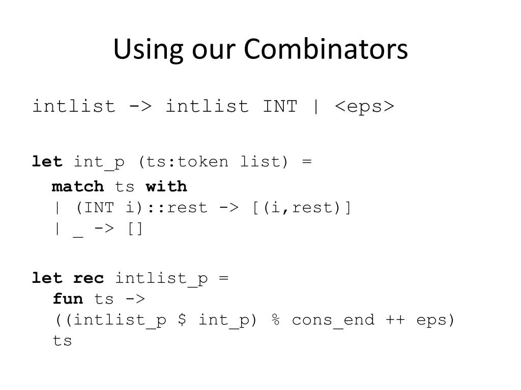 Using our Combinators intlist -> intlist INT | <eps> let int_p (ts:token list) = match tswith| (INT i)::rest -> [(i,rest)] | _ -> [] let rec intlist_p = funts -> ((intlist_p $ int_p) % cons_end ++ eps)ts