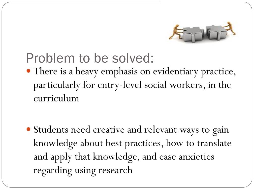 Problem to be solved: • There is a heavy emphasis on evidentiary practice, particularly for entry-level social workers, in the curriculum • Students need creative and relevant ways to gain knowledge about best practices, how to translate and apply that knowledge, and ease anxieties regarding using research