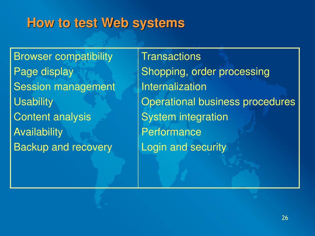 A well engineered web system • Functionally complete and correct • Usable • Robust and reliable • Maintainable • Secure • Perform satisfactorily even under flash and peak loads • Scalable • Portable, where required perform across different common platforms; compatible • with multiple browsers • Reusable • Interoperable with other Web and information systems • Universal accessibility (access by people with different kinds disabilities) • Well-documented