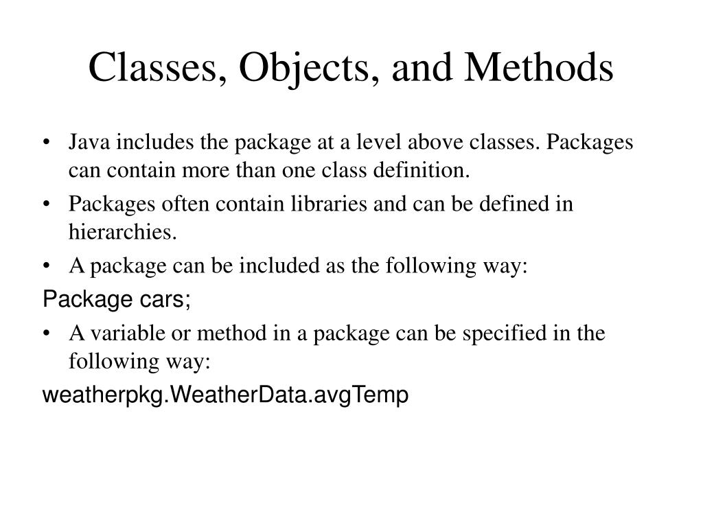 Classes, Objects, and Methods • Java includes the package at a level above classes. Packages can contain more than one class definition. • Packages often contain libraries and can be defined in hierarchies. • A package can be included as the following way: Package cars; • A variable or method in a package can be specified in the following way: weatherpkg.WeatherData.avgTemp
