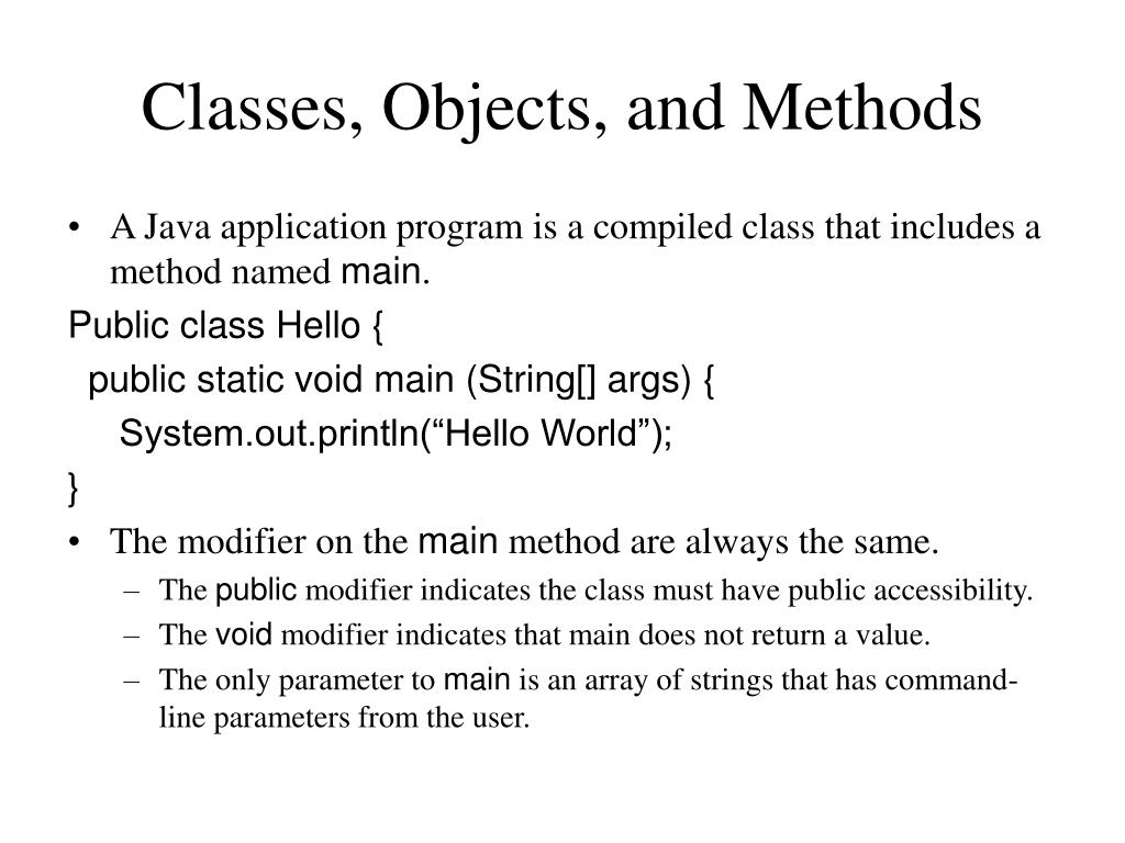 Classes, Objects, and Methods • A Java application program is a compiled class that includes a method named main. Public class Hello { public static void main (String[] args) { System.out.println(“Hello World”); } • The modifier on the main method are always the same. • The public modifier indicates the class must have public accessibility. • The void modifier indicates that main does not return a value. • The only parameter to main is an array of strings that has command-line parameters from the user.