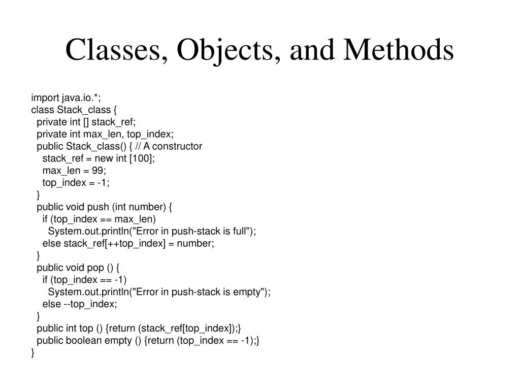 Classes, Objects, and Methods import java.io.*; class Stack_class { private int [] stack_ref; private int max_len, top_index; public Stack_class() { // A constructor stack_ref = new int [100]; max_len = 99; top_index = -1; } public void push (int number) { if (top_index == max_len) System.out.println("Error in push-stack is full"); else stack_ref[++top_index] = number; } public void pop () { if (top_index == -1) System.out.println("Error in push-stack is empty"); else --top_index; } public int top () {return (stack_ref[top_index]);} public boolean empty () {return (top_index == -1);} }