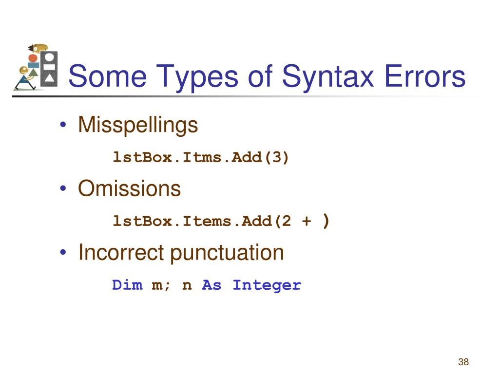 Some Types of Syntax Errors • Misspellings lstBox.Itms.Add(3) • Omissions lstBox.Items.Add(2 + ) • Incorrect punctuation Dim m; n As Integer