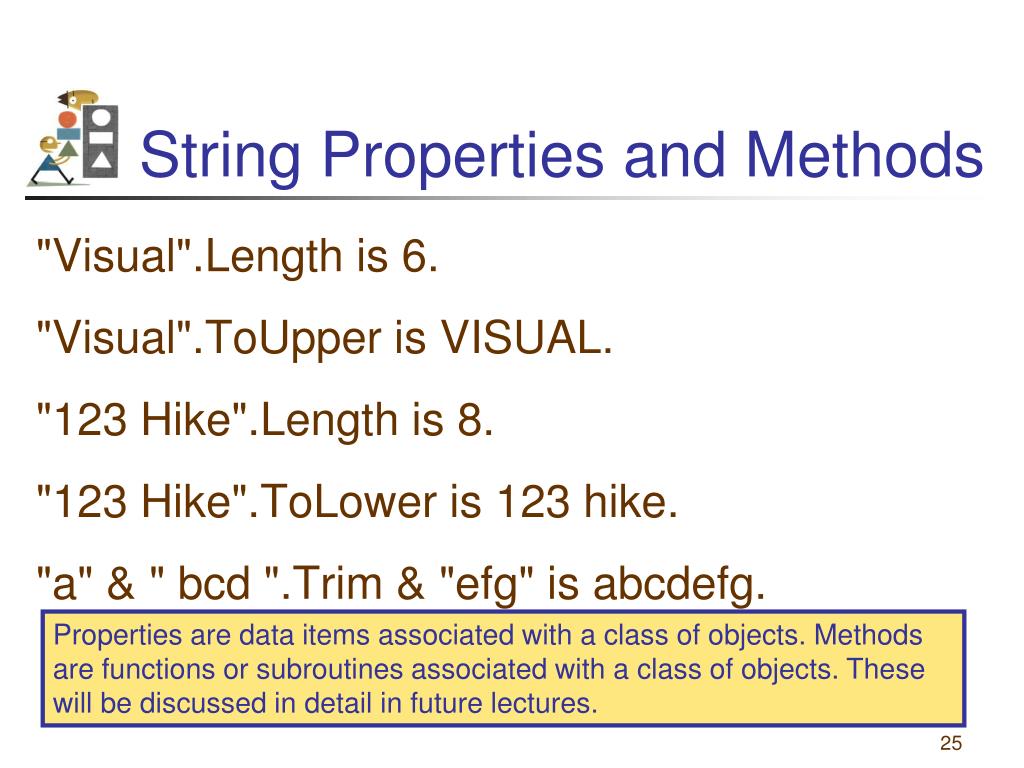 String Properties and Methods "Visual".Length is 6. "Visual".ToUpper is VISUAL. "123 Hike".Length is 8. "123 Hike".ToLower is 123 hike. "a" & " bcd ".Trim & "efg" is abcdefg. Properties are data items associated with a class of objects. Methods are functions or subroutines associated with a class of objects. These will be discussed in detail in future lectures.