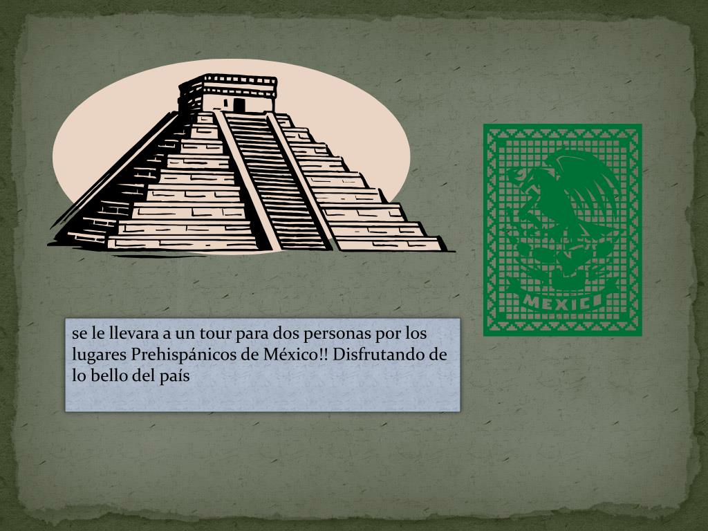 se le llevara a un tour para dos personas por los lugares Prehispánicos de México!! Disfrutando de lo bello del país