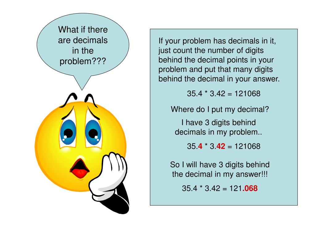 What if there are decimals in the problem??? If your problem has decimals in it, just count the number of digits behind the decimal points in your problem and put that many digits behind the decimal in your answer. 35.4 * 3.42 = 121068 Where do I put my decimal? I have 3 digits behind decimals in my problem.. 35.4 * 3.42 = 121068