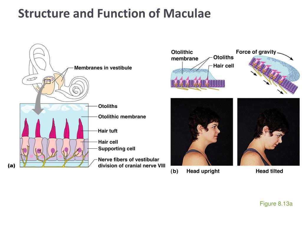 Static Equilibrium • Maculae—receptors in the vestibule • Report on the position of the head • Hair cells are embedded in the otolithic membrane • Otoliths (tiny stones) float in a gel around the hair cells • Movements cause otoliths to bend the hair cells