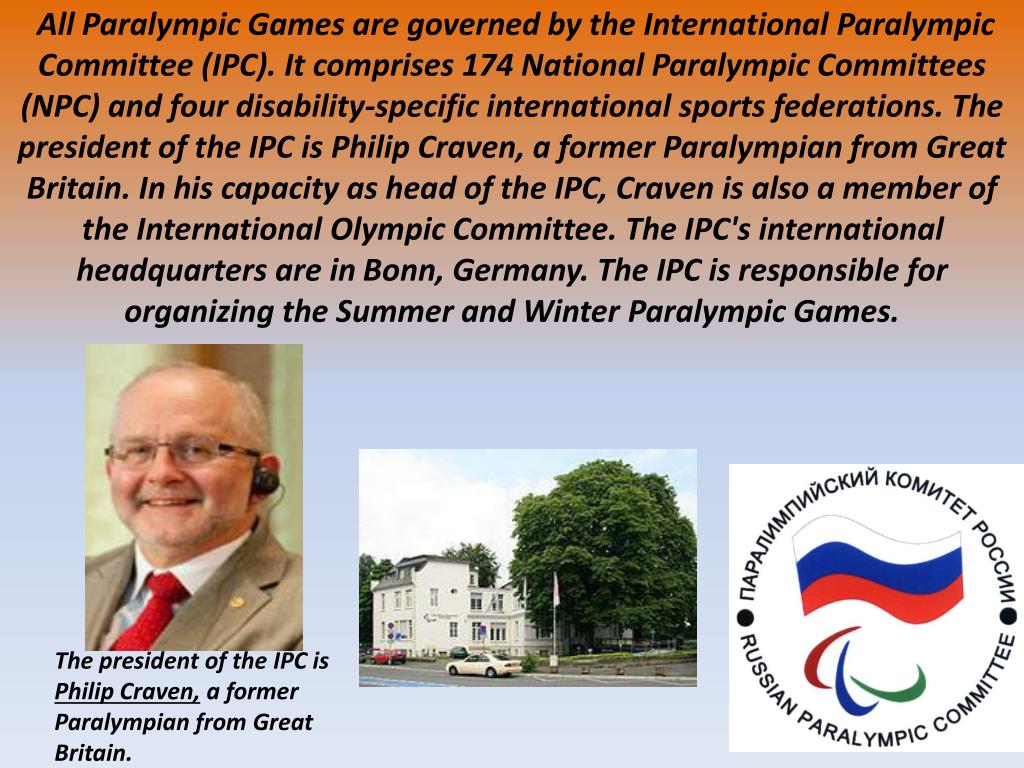 All ParalympicGamesaregovernedbytheInternationalParalympicCommittee (IPC).It comprises 174 National Paralympic Committees (NPC) and four disability-specific international sports federations. The president of the IPC is Philip Craven, a former Paralympian from Great Britain. In his capacity as head of the IPC, Craven is also a member of the International Olympic Committee. The IPC's international headquarters are in Bonn, Germany. The IPC is responsible for organizing the Summer and Winter Paralympic Games. The president of the IPC is Philip Craven,a former Paralympian from Great Britain.