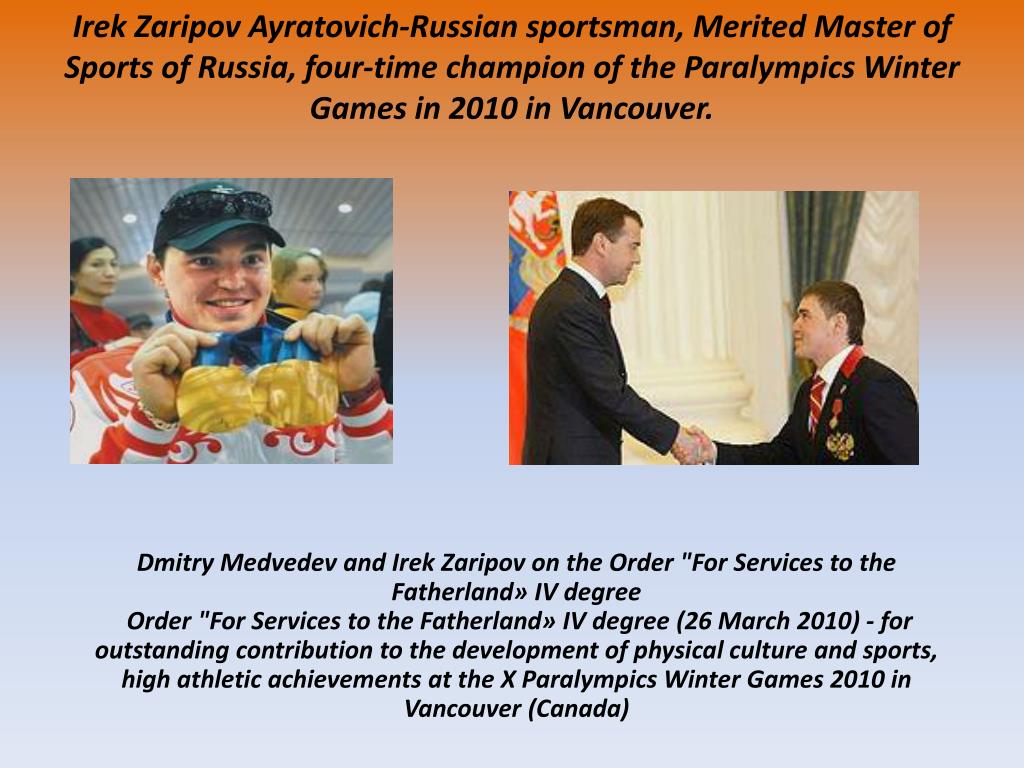 IrekZaripovAyratovich-Russiansportsman, MeritedMasterofSportsofRussia, four-timechampionoftheParalympicsWinterGamesin 2010 inVancouver. DmitryMedvedevandIrekZaripovontheOrder "ForServicestotheFatherland» IV degreeOrder "ForServicestotheFatherland» IV degree (26 March 2010) - foroutstandingcontributiontothedevelopmentofphysicalcultureandsports, highathleticachievementsatthe X ParalympicsWinterGames 2010 inVancouver (Canada)