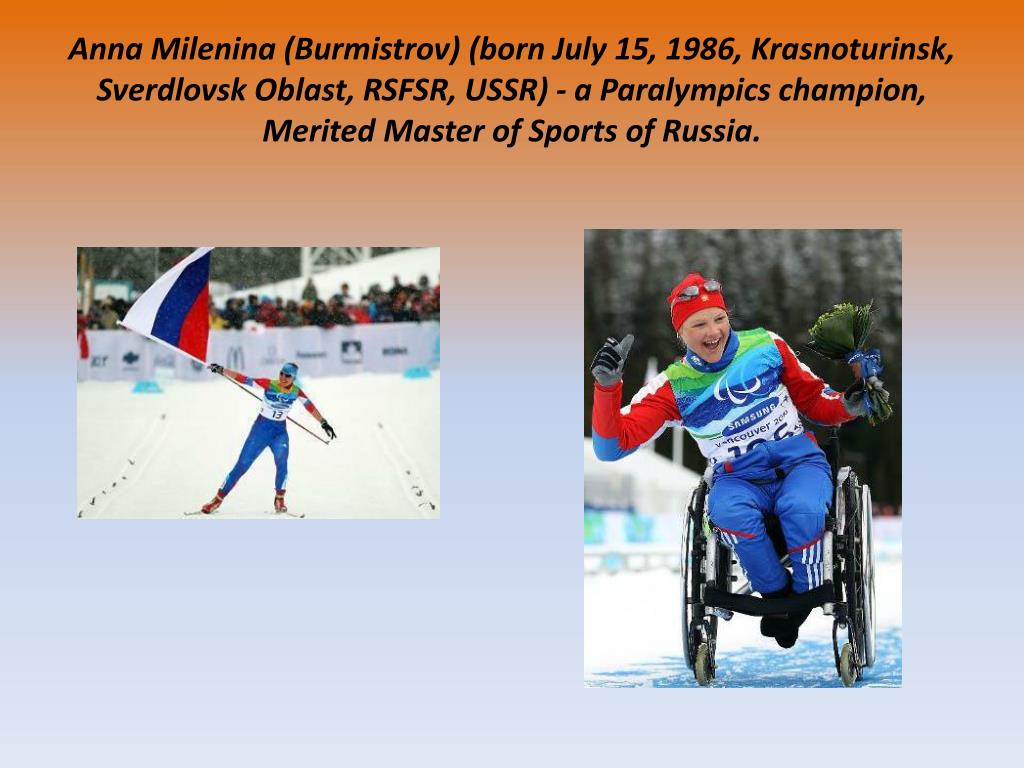 AnnaMilenina (Burmistrov) (bornJuly 15, 1986, Krasnoturinsk, SverdlovskOblast, RSFSR, USSR) - a Paralympicschampion, MeritedMasterofSportsofRussia.