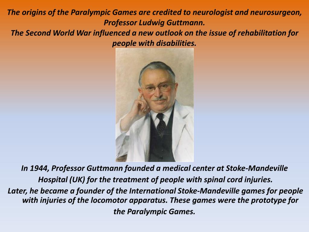 The originsoftheParalympicGamesarecreditedtoneurologistandneurosurgeon, ProfessorLudwigGuttmann.The SecondWorldWarinfluencedanewoutlookontheissueofrehabilitationforpeoplewithdisabilities. In 1944, ProfessorGuttmannfoundedamedicalcenteratStoke-Mandeville Hospital (UK) forthetreatmentofpeoplewithspinalcordinjuries. Later, hebecameafounderoftheInternationalStoke-Mandevillegamesforpeoplewithinjuriesofthelocomotorapparatus. Thesegamesweretheprototypefor theParalympicGames.