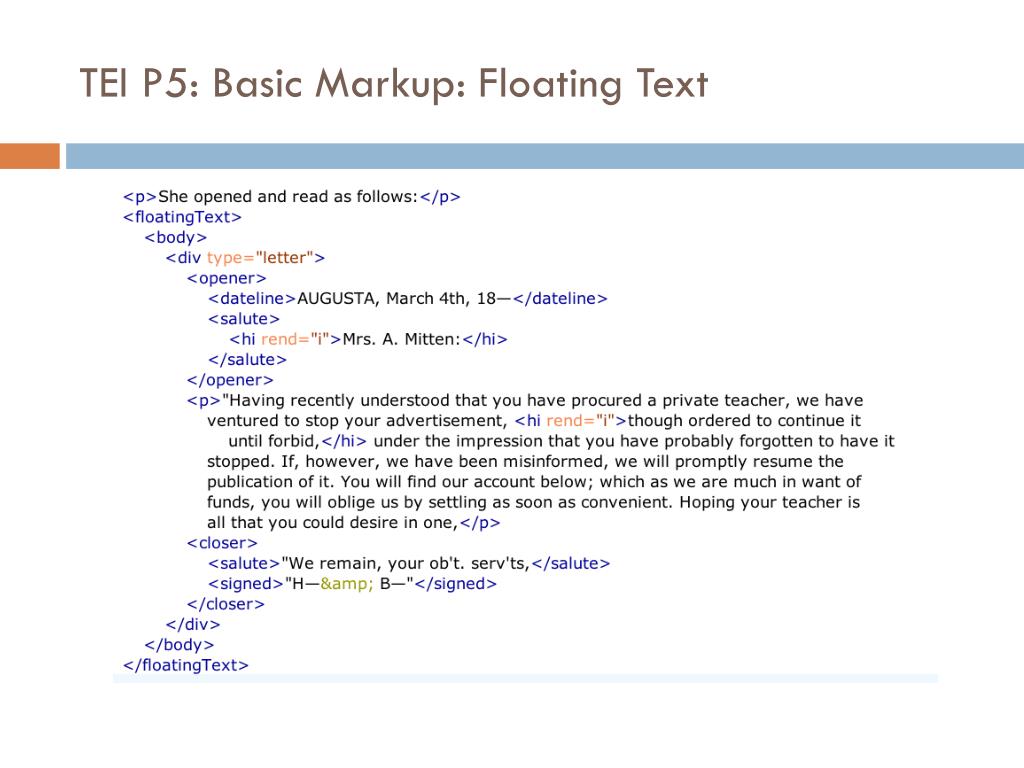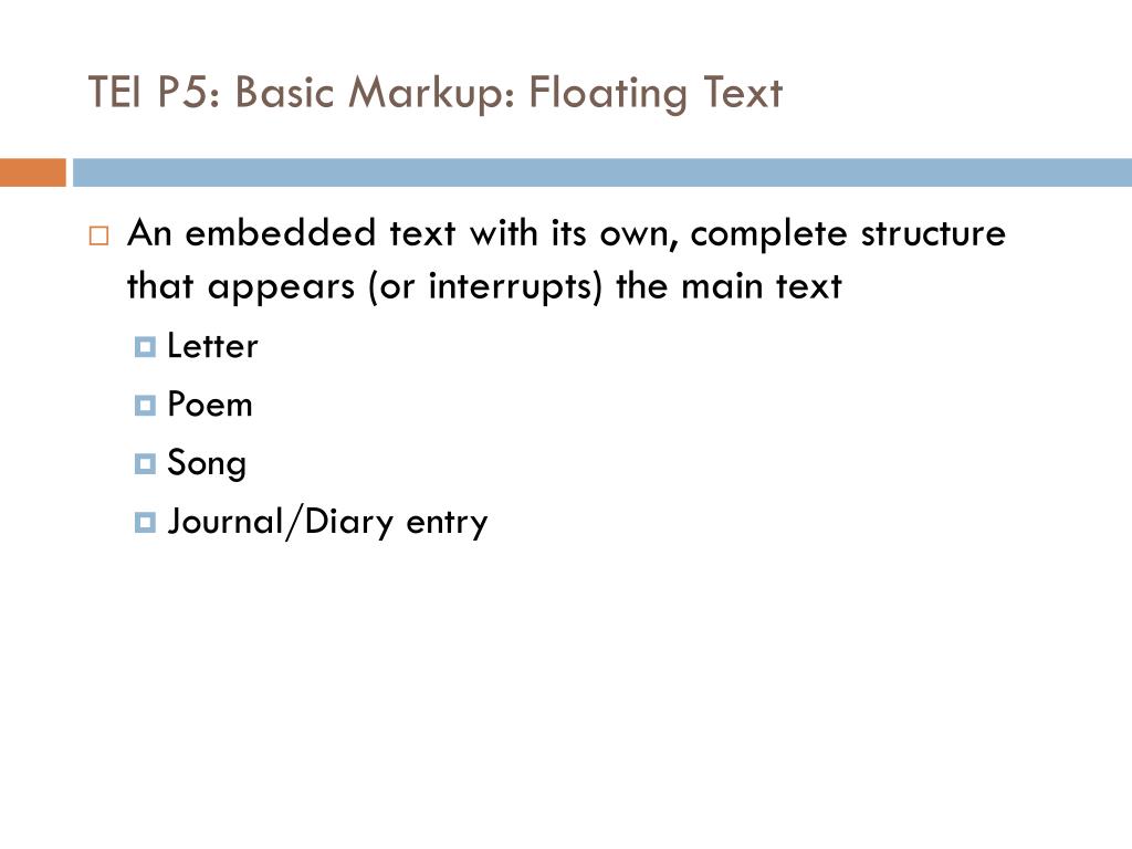 TEI P5: Basic Markup: Floating Text • An embedded text with its own, complete structure that appears (or interrupts) the main text • Letter • Poem • Song • Journal/Diary entry