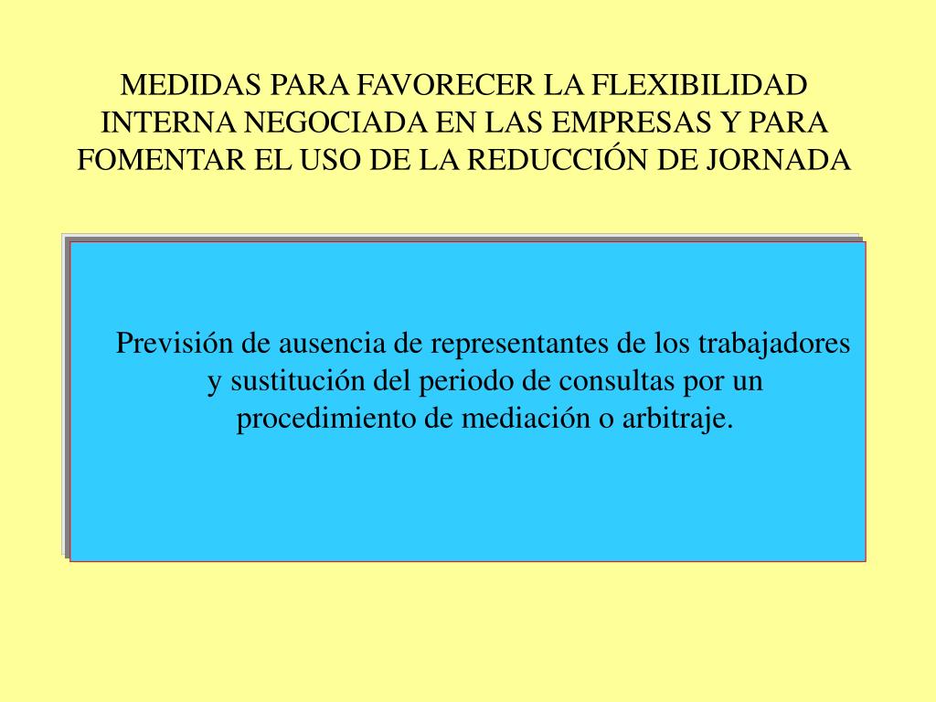 MEDIDAS PARA FAVORECER LA FLEXIBILIDAD INTERNA NEGOCIADA EN LAS EMPRESAS Y PARA FOMENTAR EL USO DE LA REDUCCIÓN DE JORNADA Previsión de ausencia de representantes de los trabajadores y sustitución del periodo de consultas por un procedimiento de mediación o arbitraje.