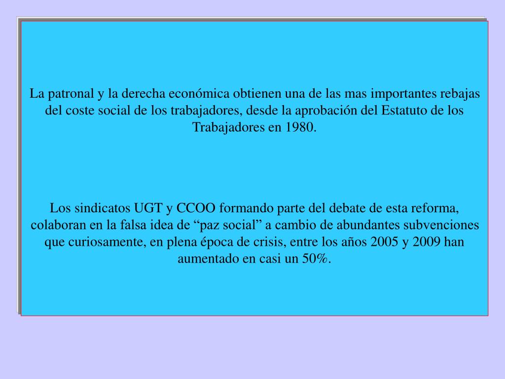 La patronal y la derecha económica obtienen una de las mas importantes rebajas del coste social de los trabajadores, desde la aprobación del Estatuto de los Trabajadores en 1980. Los sindicatos UGT y CCOO formando parte del debate de esta reforma, colaboran en la falsa idea de “paz social” a cambio de abundantes subvenciones que curiosamente, en plena época de crisis, entre los años 2005 y 2009 han aumentado en casi un 50%.