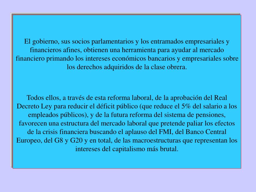 El gobierno, sus socios parlamentarios y los entramados empresariales y financieros afines, obtienen una herramienta para ayudar al mercado financiero primando los intereses económicos bancarios y empresariales sobre los derechos adquiridos de la clase obrera. Todos ellos, a través de esta reforma laboral, de la aprobación del Real Decreto Ley para reducir el déficit público (que reduce el 5% del salario a los empleados públicos), y de la futura reforma del sistema de pensiones, favorecen una estructura del mercado laboral que pretende paliar los efectos de la crisis financiera buscando el aplauso del FMI, del Banco Central Europeo, del G8 y G20 y en total, de las macroestructuras que representan los intereses del capitalismo más brutal.