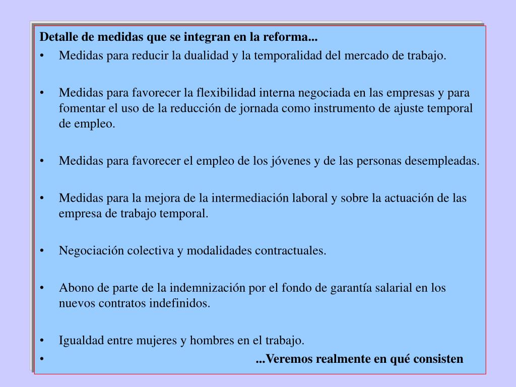 Detalle de medidas que se integran en la reforma... • Medidas para reducir la dualidad y la temporalidad del mercado de trabajo. • Medidas para favorecer la flexibilidad interna negociada en las empresas y para fomentar el uso de la reducción de jornada como instrumento de ajuste temporal de empleo. • Medidas para favorecer el empleo de los jóvenes y de las personas desempleadas. • Medidas para la mejora de la intermediación laboral y sobre la actuación de las empresa de trabajo temporal. • Negociación colectiva y modalidades contractuales. • Abono de parte de la indemnización por el fondo de garantía salarial en los nuevos contratos indefinidos. • Igualdad entre mujeres y hombres en el trabajo. • ...Veremos realmente en qué consisten