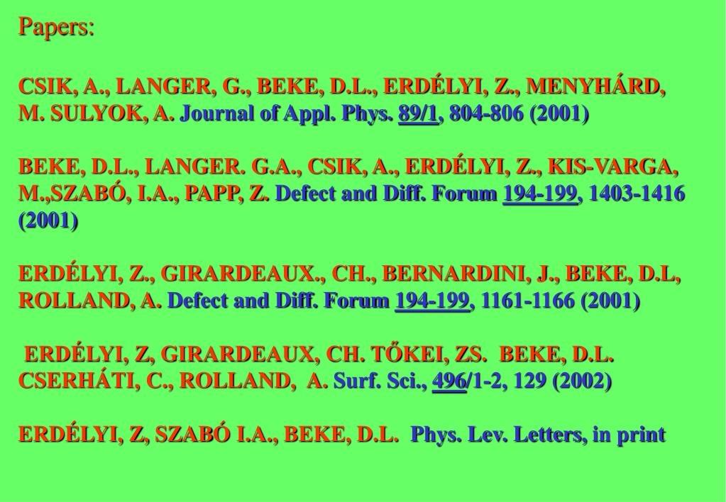 Papers: CSIK, A., LANGER, G., BEKE, D.L., ERDÉLYI, Z., MENYHÁRD, M. SULYOK, A. Journal of Appl. Phys. 89/1, 804-806 (2001) BEKE, D.L., LANGER. G.A., CSIK, A., ERDÉLYI, Z., KIS-VARGA, M.,SZABÓ, I.A., PAPP, Z. Defect and Diff. Forum 194-199, 1403-1416 (2001) ERDÉLYI, Z., GIRARDEAUX., CH., BERNARDINI, J., BEKE, D.L, ROLLAND, A. Defect and Diff. Forum 194-199, 1161-1166 (2001) ERDÉLYI, Z, GIRARDEAUX, CH. TŐKEI, ZS. BEKE, D.L. CSERHÁTI, C., ROLLAND, A. Surf. Sci., 496/1-2, 129 (2002) ERDÉLYI, Z, SZABÓ I.A., BEKE, D.L. Phys. Lev. Letters,in print