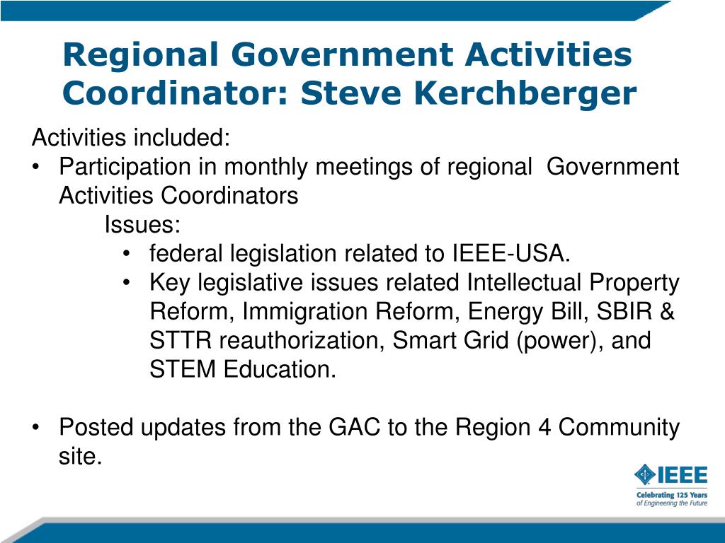 Regional Government Activities Coordinator: Steve Kerchberger • Activities included: • Participation in monthly meetings of regional Government Activities Coordinators • Issues: • federal legislation related to IEEE-USA. • Key legislative issues related Intellectual Property Reform, Immigration Reform, Energy Bill, SBIR & STTR reauthorization, Smart Grid (power), and STEM Education. • Posted updates from the GAC to the Region 4 Community site.