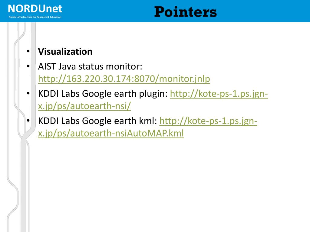 Pointers • Visualization • AIST Java status monitor: http://163.220.30.174:8070/monitor.jnlp • KDDI Labs Google earth plugin: http://kote-ps-1.ps.jgn-x.jp/ps/autoearth-nsi/ • KDDI Labs Google earth kml: http://kote-ps-1.ps.jgn-x.jp/ps/autoearth-nsiAutoMAP.kml