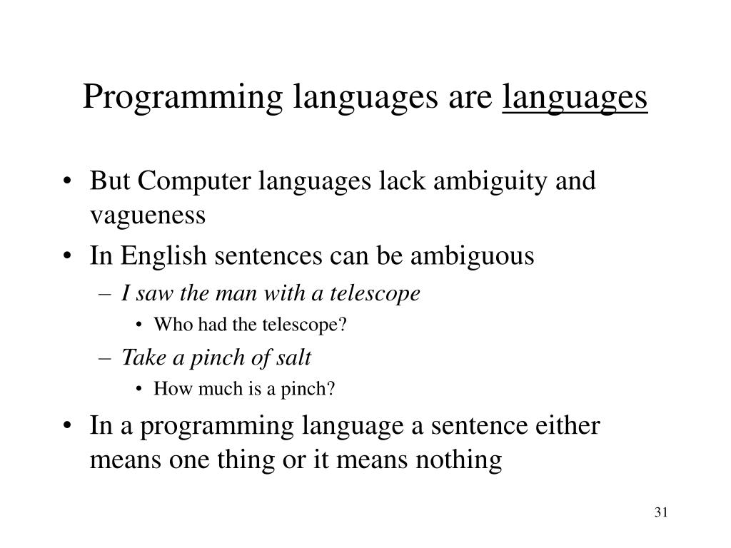 Programming languages are languages • But Computer languages lack ambiguity and vagueness • In English sentences can be ambiguous • I saw the man with a telescope • Who had the telescope? • Take a pinch of salt • How much is a pinch? • In a programming language a sentence either means one thing or it means nothing
