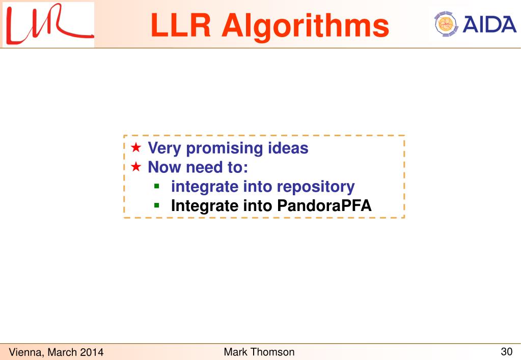 LLR Algorithms • Very promising ideas • Now need to: • integrate into repository • Integrate into PandoraPFA Mark Thomson