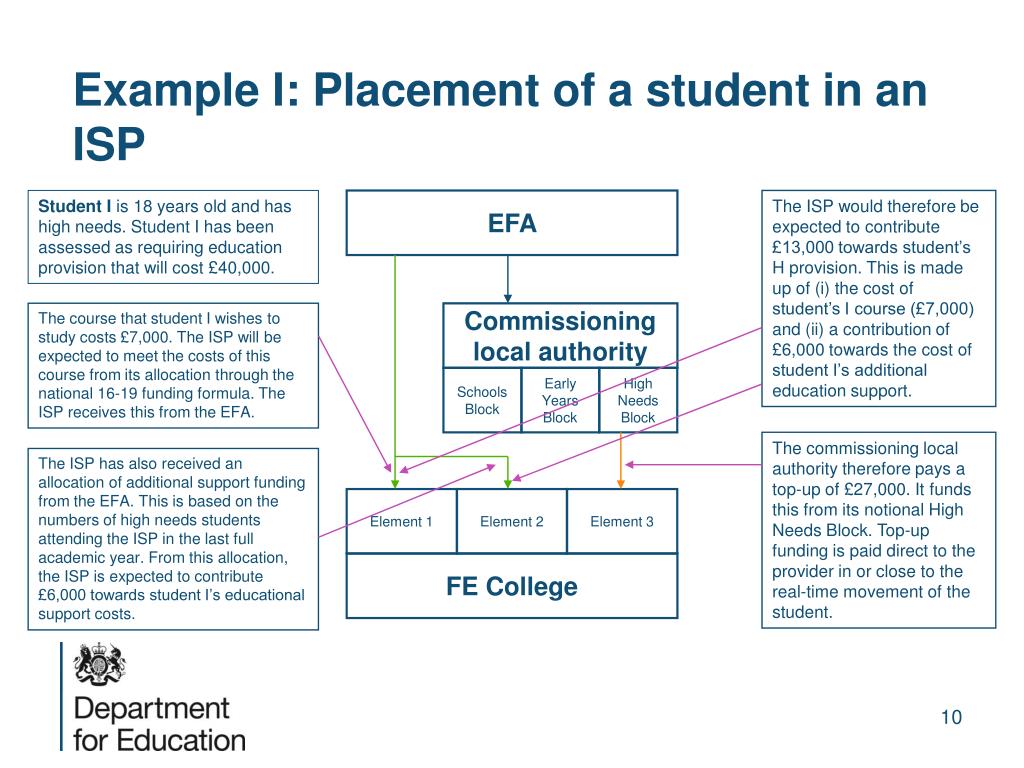Example I: Placement of a student in an ISP EFA Commissioning local authority Schools Block Element 1 Early Years Block Element 2 High Needs Block Element 3 FE College Student I is 18 years old and has high needs. Student I has been assessed as requiring education provision that will cost £40,000. The ISP would therefore be expected to contribute £13,000 towards student’s H provision. This is made up of (i) the cost of student’s I course (£7,000) and (ii) a contribution of £6,000 towards the cost of student I’s additional education support. The course that student I wishes to study costs £7,000. The ISP will be expected to meet the costs of this course from its allocation through the national 16-19 funding formula. The ISP receives this from the EFA. The commissioning local authority therefore pays a top-up of £27,000. It funds this from its notional High Needs Block. Top-up funding is paid direct to the provider in or close to the real-time movement of the student. The ISP has also received an allocation of additional support funding from the EFA. This is based on the numbers of high needs students attending the ISP in the last full academic year. From this allocation, the ISP is expected to contribute £6,000 towards student I’s educational support costs.