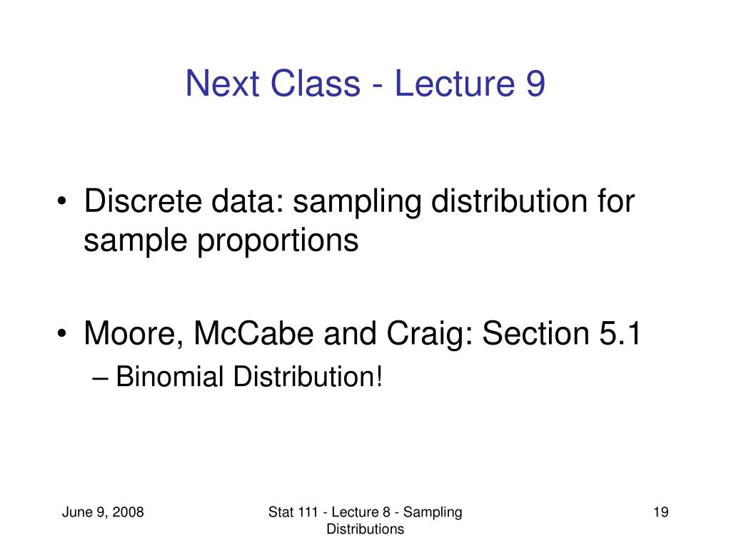 Next Class - Lecture 9 • Discrete data: sampling distribution for sample proportions • Moore, McCabe and Craig: Section 5.1 • Binomial Distribution! Stat 111 - Lecture 8 - Sampling Distributions
