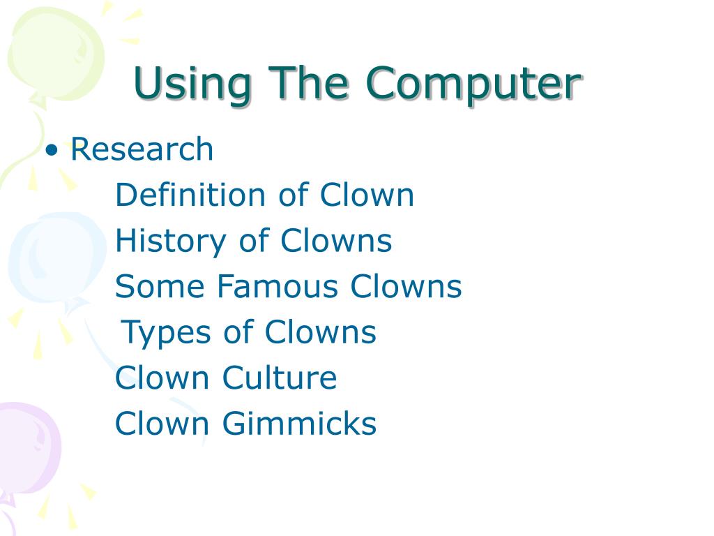 Using The Computer • Research Definition of Clown History of Clowns Some Famous Clowns Types of Clowns Clown Culture Clown Gimmicks