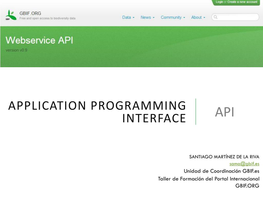 Application Programming Interface. SANTIAGO MARTÍNEZ DE LA RIVA sama@gbif.es Unidad de Coordinación GBIF.es Taller de Formación del Portal Internacional GBIF.ORG. API. ÍNDICE_. APPLICATION PROGRAMMING INTERFACE. 1. ¿Qué es una API? ( wiki ).