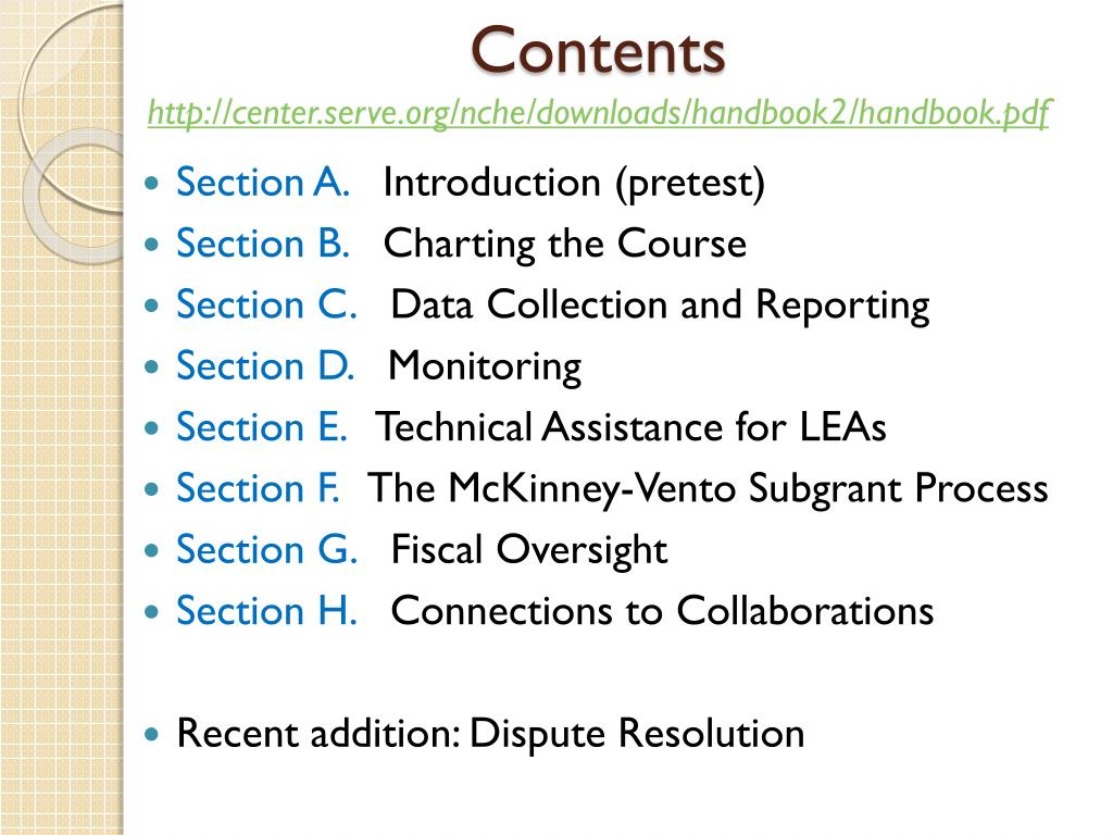 Contentshttp://center.serve.org/nche/downloads/handbook2/handbook.pdfContentshttp://center.serve.org/nche/downloads/handbook2/handbook.pdf Section A. Introduction (pretest) Section B. Charting the Course Section C. Data Collection and Reporting Section D. Monitoring Section E. Technical Assistance for LEAs Section F. The McKinney-Vento Subgrant Process Section G. Fiscal Oversight Section H. Connections to Collaborations Recent addition: Dispute Resolution